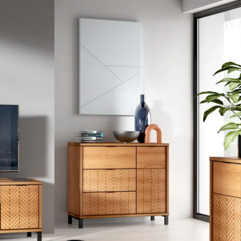 Funktionale Kommode aus der FONTI-Kollektion. Trotz ihrer kleineren Größe kann sie viele Dinge aufnehmen! Auf der linken Seite befinden sich drei geräumige Schubladen für Kleidung, Wäsche und Kleinteile, und auf der rechten Seite ein Schrank mit einem Regal, das den Raum in zwei Hälften teilt. Erhältlich in der Farbe Karamelleiche.