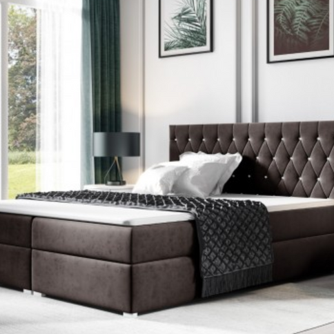 Das Bett umfasst ein sorgfältig gestepptes Kopfteil mit tiefen Knöpfen oder Kristallen sowie zwei Boxen mit Stauraum für Bettwäsche und zwei Taschenfederkernmatratzen auf einem Holzrahmen, die sich mit einem Federmechanismus öffnen lassen.