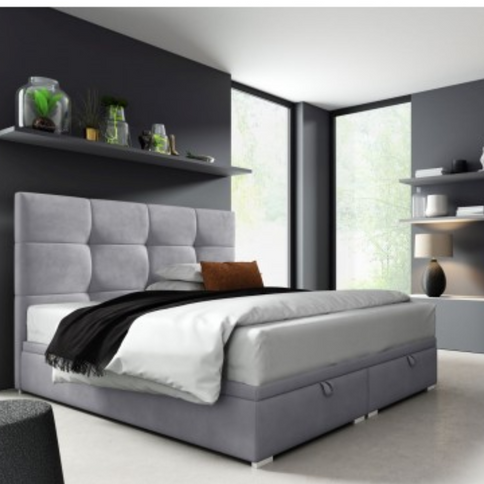 Das Bett besteht aus einem sorgfältig gesteppten Kopfteil und zwei Boxen mit Stauraum für Bettwäsche sowie einem Gestell auf einem Holzrahmen, das sich mit Gasdruckfedern öffnen lässt.