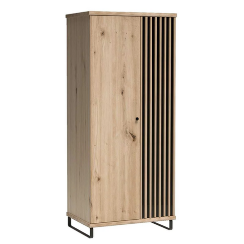 Großer, geräumiger Kleiderschrank mit Regalen und einer Stange zum Aufhängen von Kleidung. Ideal für Wohnzimmer oder Schlafzimmer. Die dekorativen Lamellenleisten verleihen dem Schrank einen interessanten Charakter, während der kleine Griff ein beachtenswertes Detail ist, das sich perfekt in den Farbton des Artisan-Schrankes einfügt. Der Schrank kann auf stabilen Metallbeinen mit einer Höhe von 10 cm platziert werden.