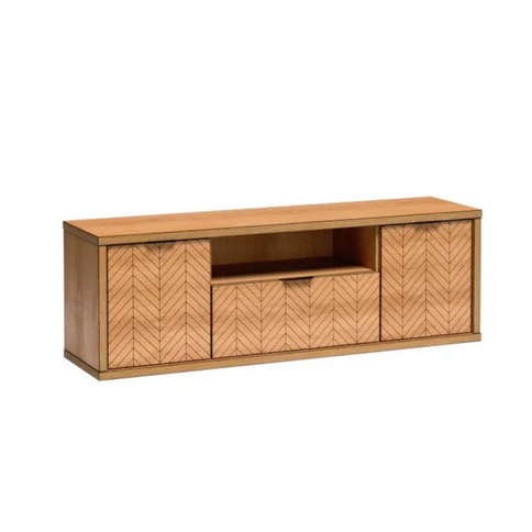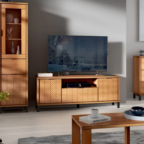 Der klassische TV-Schrank aus der FONTI-Kollektion mit einer Schublade in der Mitte und einem Regal darüber für den Decoder oder andere Geräte. An den Seiten befinden sich Schränke mit geschlossenen Türen, in denen Regale für verschiedene Zubehörteile und Kleinteile untergebracht sind. Erhältlich in der Farbe Karamelleiche.