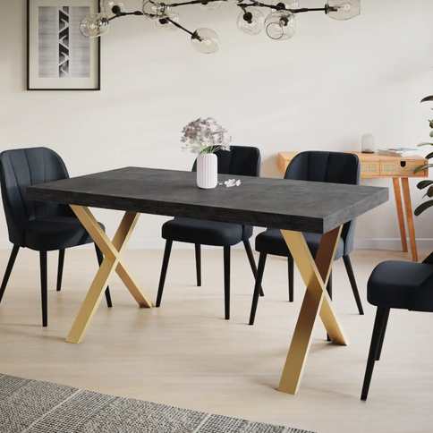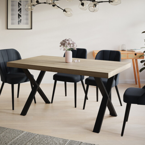 Einzigartiger Loft-Tisch mit X-förmigen Metallbeinen und einer Tischplatte aus laminierten Platten.