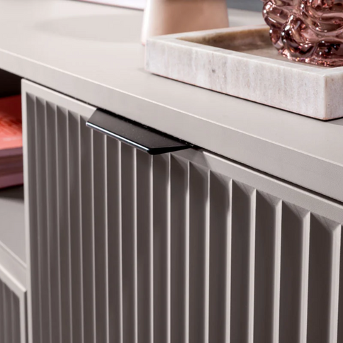 Der TV-Schrank ist mit einer großen Schublade in der Mitte ausgestattet, um Multimediazubehör oder andere Gegenstände mit bequemem Zugang zu verstauen. Über der Schublade befindet sich ein Regal für Mediengeräte wie DVD-Player oder Spielekonsolen. An den Seiten des TV-Schranks befinden sich zwei Schränke, die ideal für die Aufbewahrung von DVDs, Büchern oder anderen Gegenständen geeignet sind, die eine etwas diskretere Platzierung erfordern.