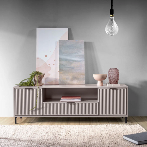 Die eleganten Metallfüße in Schwarz mit einer Länge von 12 cm verleihen der TV-Schrank eine raffinierte Optik, während die metallischen Scharniere mit geräuschlosem Schließen die Nutzung noch komfortabler machen.