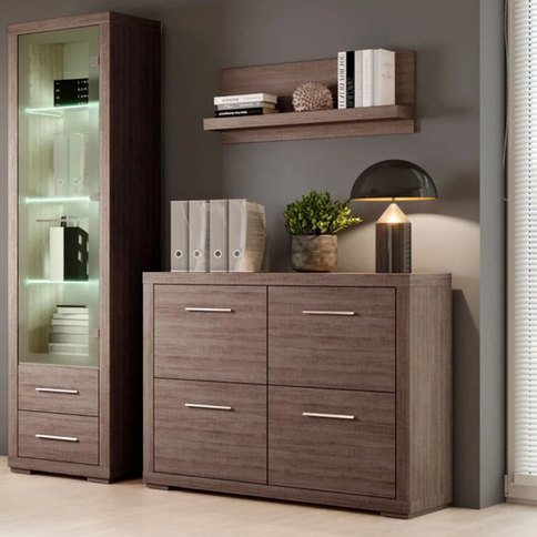 Комод з колекції Vegas. Він має чотири двері, що робить його дуже функціональним і унікальним за дизайном. Всередині є перегородка, яка ділить шафи на дві полиці. Він підходить як для вітальні, так і для спальні або офісу. Металеві ручки точно підібрані до крою та кольору меблів. Доступний у чотирьох різних кольорах.