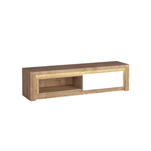 Ліва частина телевізійної шафи оснащена відкритою полицею, яка ідеально підходить для зберігання медіа-пристроїв, таких як DVD-плеєри або ігрові консолі, забезпечуючи легкий доступ і вентиляцію. Права частина містить відділення, що замикається, із передньою частиною, що відкидається, і забезпечує приховане місце для зберігання. Це робить його ідеальним для розміщення різних предметів, від пультів дистанційного керування до особистих речей, які ви хочете тримати подалі від очей.