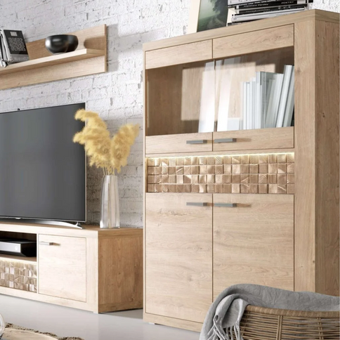 Верхня частина вітрини оснащена дверцятами із загартованого скла, що забезпечує безпеку та довговічність. За скляними дверцятами є скляна полиця, яка ідеально підходить для демонстрації декоративних предметів або колекцій. Нижня шафа з передньою частиною на всю довжину містить полицю для більших речей, а над шафою є практичний ящик із системою push-to-open, яка відкривається легким поштовхом. За бажанням вітрина може бути оснащена світлодіодним підсвічуванням, щоб підкреслити красу виставлених на полицях товарів і створити додаткову атмосферу в кімнаті.
